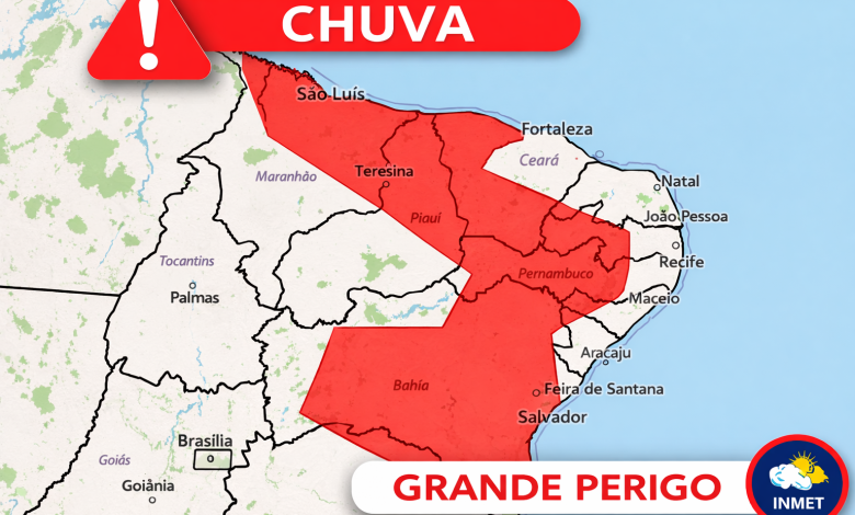 O Instituto Nacional de Meteorologia (INMET) emitiu um alerta de grande perigo para acumulado de chuvas no Nordeste baiano. O aviso teve início às 10h33 deste sábado, 28 de fevereiro de 2026, e segue válido até as 23h59 do domingo, 1º de março.