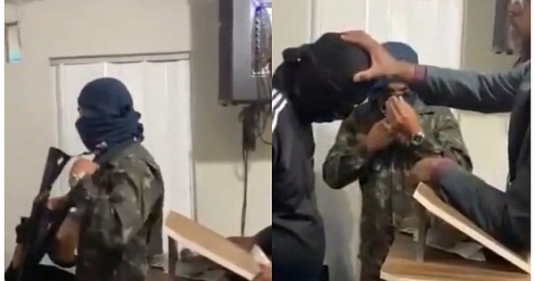 Em outro momento, outro homem é repreendido pelo colega de facção.”Coé menor, atividade aí, com todo o respeito, vamos tirar a arma da igreja aqui”, comentou o integrante, pegando o fuzil.