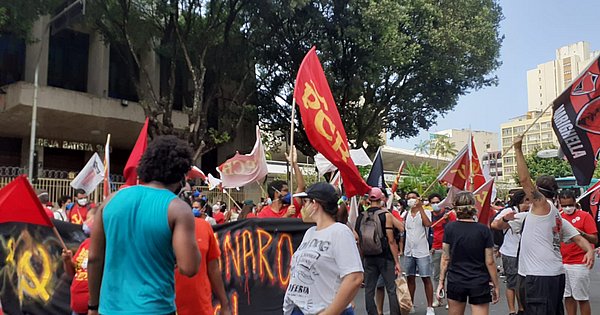 Durante o percurso, os manifestantes gritavam palavras de ordem como “Ninguém aguenta mais: fora Bolsonaro e seus generais”; “Vacina, comida! Fora, genocida!”; e “O preço da comida não para de subir. Ei, Bolsonaro, eu vou fazer você cair”.
