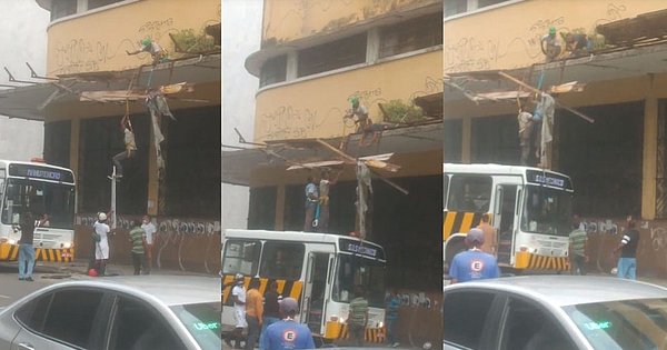 Dois operários que trabalham na reforma do prédio onde funcionava o Instituto do Cacau, em Salvador, ficaram pendurados pelo cinto de proteção após caírem durante o trabalho. O caso aconteceu na manhã desta quinta-feira (4).
