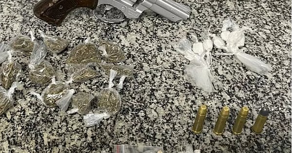Com ele foram apreendidos um revólver calibre 38, um coldre, oito pacotes de uma substância análoga a cocaína, 19 porções de uma erva esverdeada aparentando ser maconha e 40 pedras de uma substância análoga a crack.